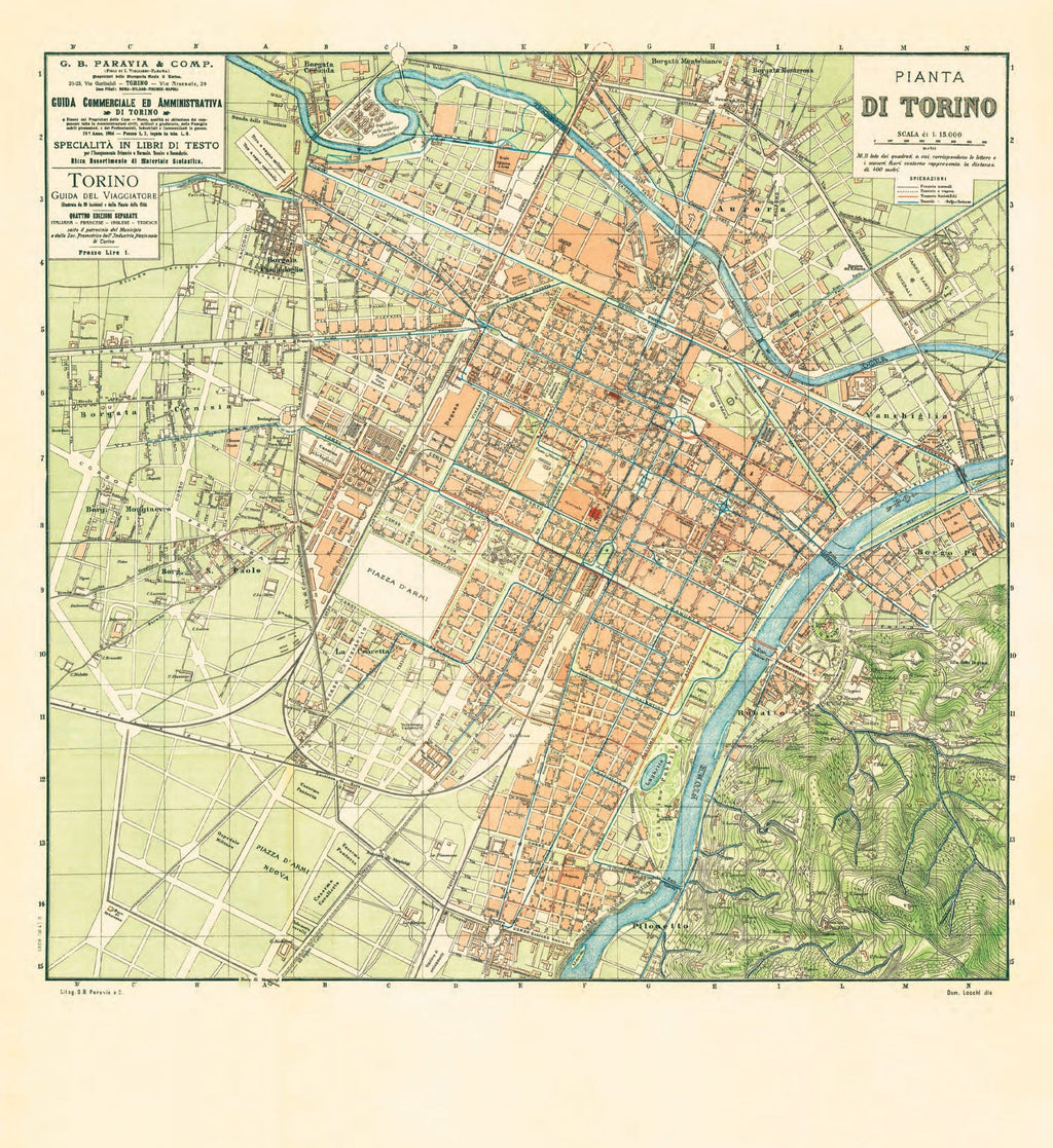 La mappa, edita nel 1906, mette in evidenza la nuova cinta daziaria, sviluppatasi per 12 chilometri lungo il perimetro di Torino tra il 1853 e il 1858. Venne realizzata per motivi fiscali: lo Statuto albertino del 1848 aveva concesso ai Comuni il diritto di riscuotere dazi locali, il cui pagamento avveniva in corrispondenza delle barriere d’ingresso alla città. Accanto a essa correvano stradine che poi diventeranno i grandi corsi della Torino contemporanea: Bramante, Lepanto, Ferrucci, Tassoni, Svizzera, Mortara, Vigevano, Novara e Tortona. La mappa è stampata su su carta avoriata 44x48 cm.