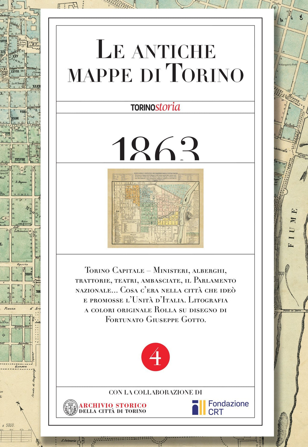 La pianta, oltre a fotografare l’assetto topografico nell’anno 1863, evidenzia anche gli ingrandimenti progettati per la città che è appena diventata capitale d'Italia e guarda al futuro con entusiasmo. Liberata da mura e bastioni difensivi, abbattuti durante il periodo napoleonico, Torino è ormai ricca di giardini e viali alberati che ne delimitano il perimetro, mentre a est sorgono la maestosa piazza Vittorio Emanuele (oggi Vittorio Veneto) e, sulla sponda opposta, il Borgo Po che lambisce la collina con la chiesa della Gran Madre di Dio. La mappa è stampata su carta avoriata 60x44 cm.